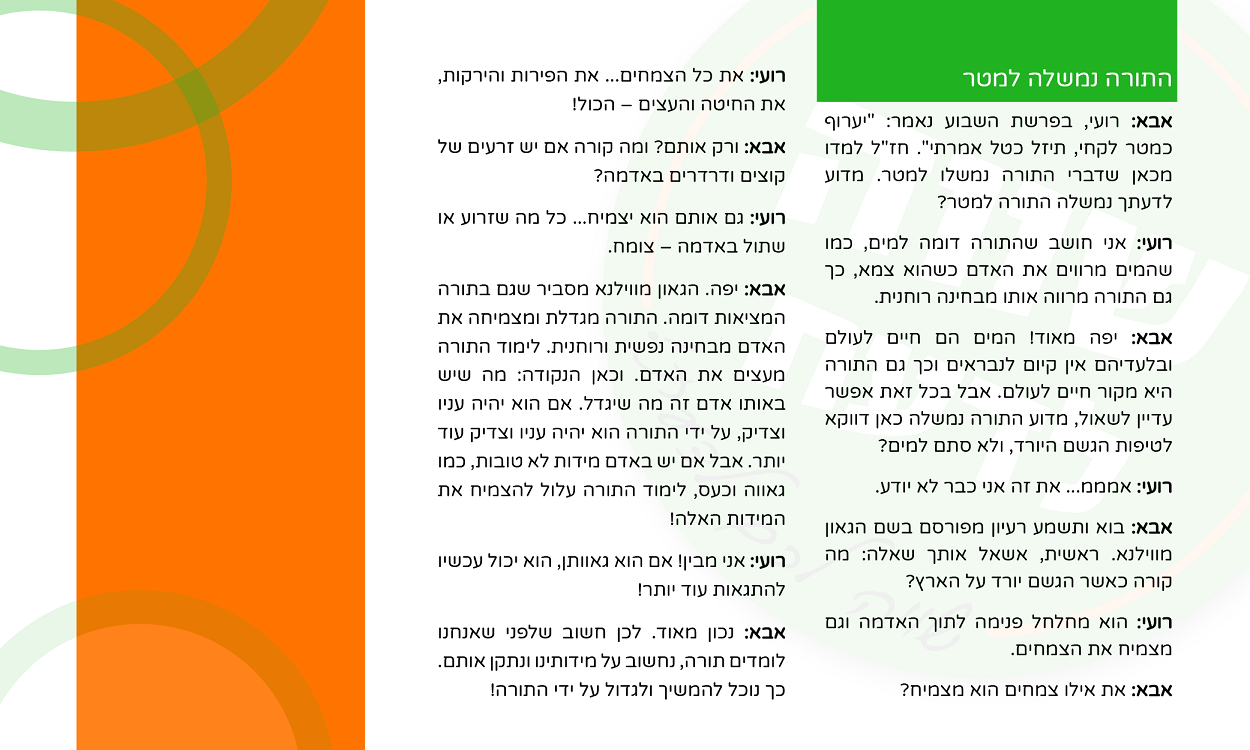 פינות 'שווה לדעת' ו'טבע בפרשה' ובהן דברים להרחבת הידע סביב הפרשה והנושאים שבה.